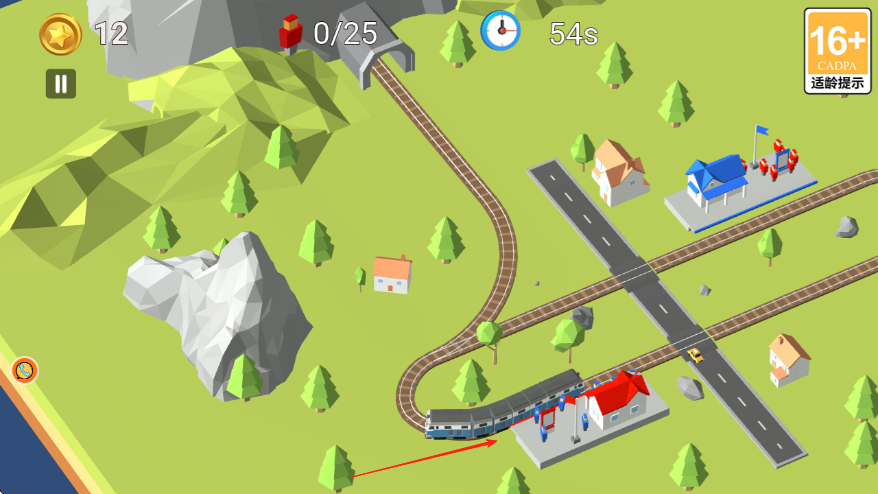 3、持續(xù)規(guī)劃火車行駛路徑,及時(shí)啟停火車,按紅箭頭指引完成更多運(yùn)輸任務(wù),在規(guī)定時(shí)間內(nèi)達(dá)成【0/25】目標(biāo)。