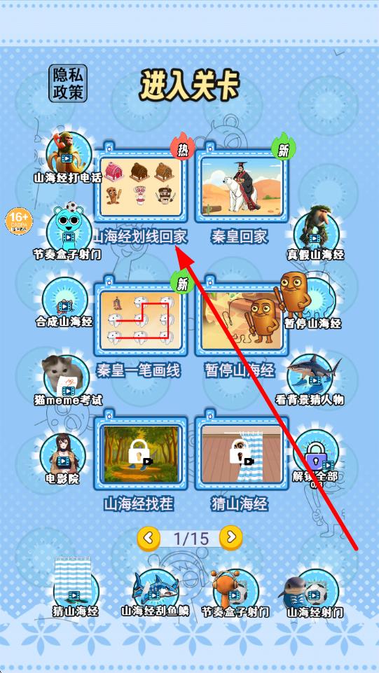 1、在游戲關(guān)卡選擇界面,找到標(biāo)有山海經(jīng)劃線回家且?guī)針?biāo)識(shí)的關(guān)卡,點(diǎn)擊進(jìn)入,開啟該關(guān)卡挑戰(zhàn)。