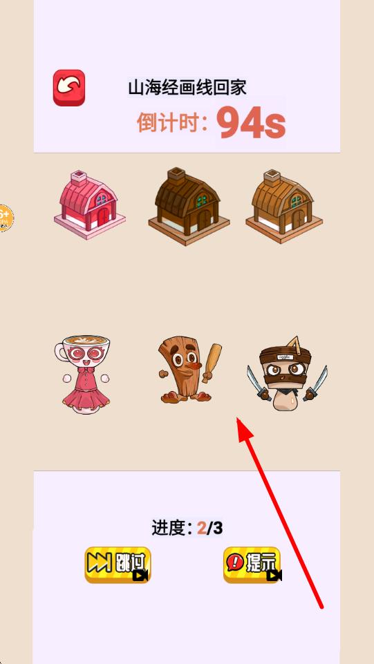 3、繼續(xù)山海經(jīng)畫線回家關(guān)卡,此時(shí)倒計(jì)時(shí)94秒,新增角色與房屋,依據(jù)布局為角色規(guī)劃合理路線,使角色歸位,完成階段目標(biāo)。