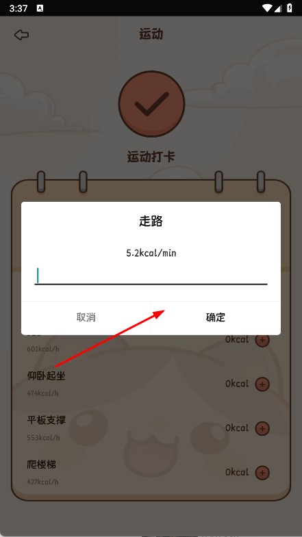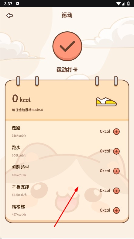 2、在運(yùn)動(dòng)打卡頁,選擇運(yùn)動(dòng)項(xiàng)目,如走路、仰臥起坐等,點(diǎn)擊項(xiàng)目右側(cè)的加號(hào)。