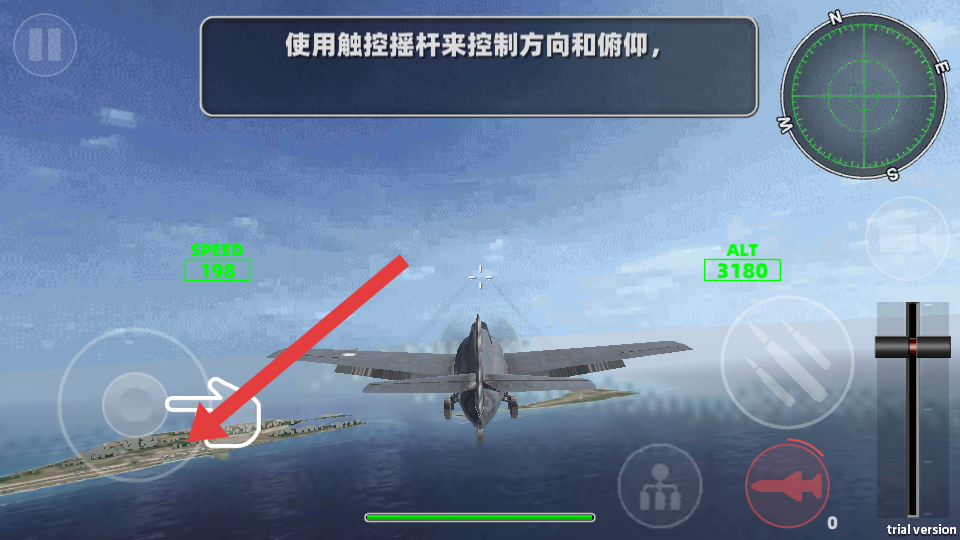 1、搖桿控制:拖動左側(cè)觸控搖桿,可調(diào)整戰(zhàn)機的飛行方向左右與俯仰上下,進而改變飛行姿態(tài)。