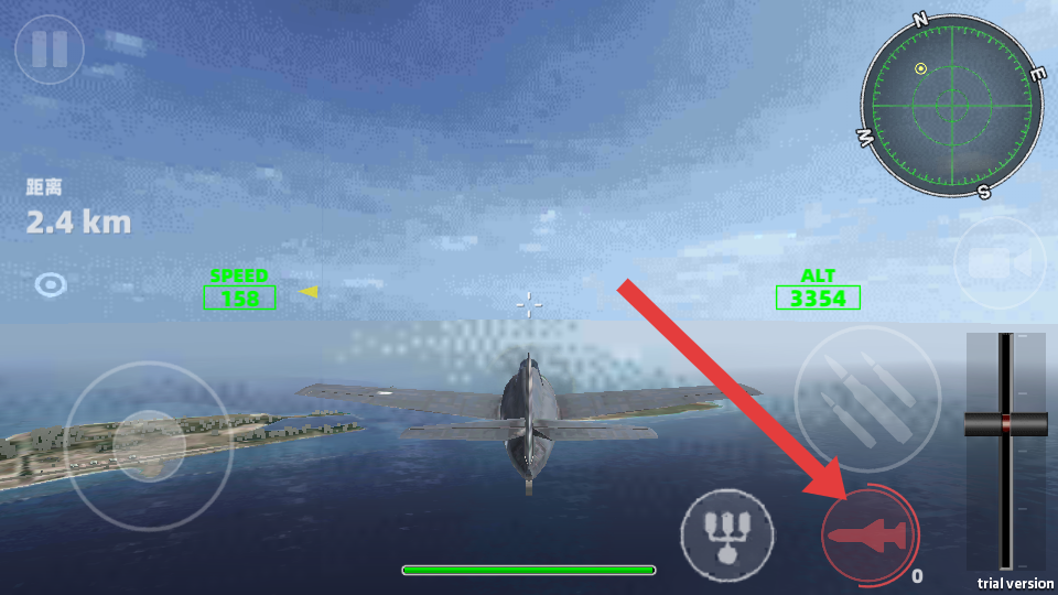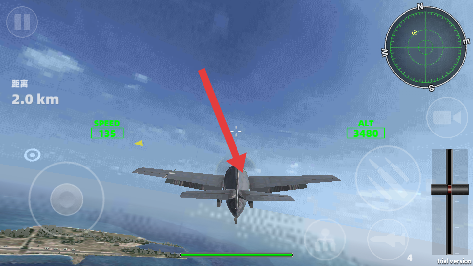 3、目標(biāo)追蹤:雷達羅盤呈現(xiàn)目標(biāo)位置,距離從2.4km縮短至2.0km,調(diào)整搖桿使戰(zhàn)機朝目標(biāo)方向飛行。