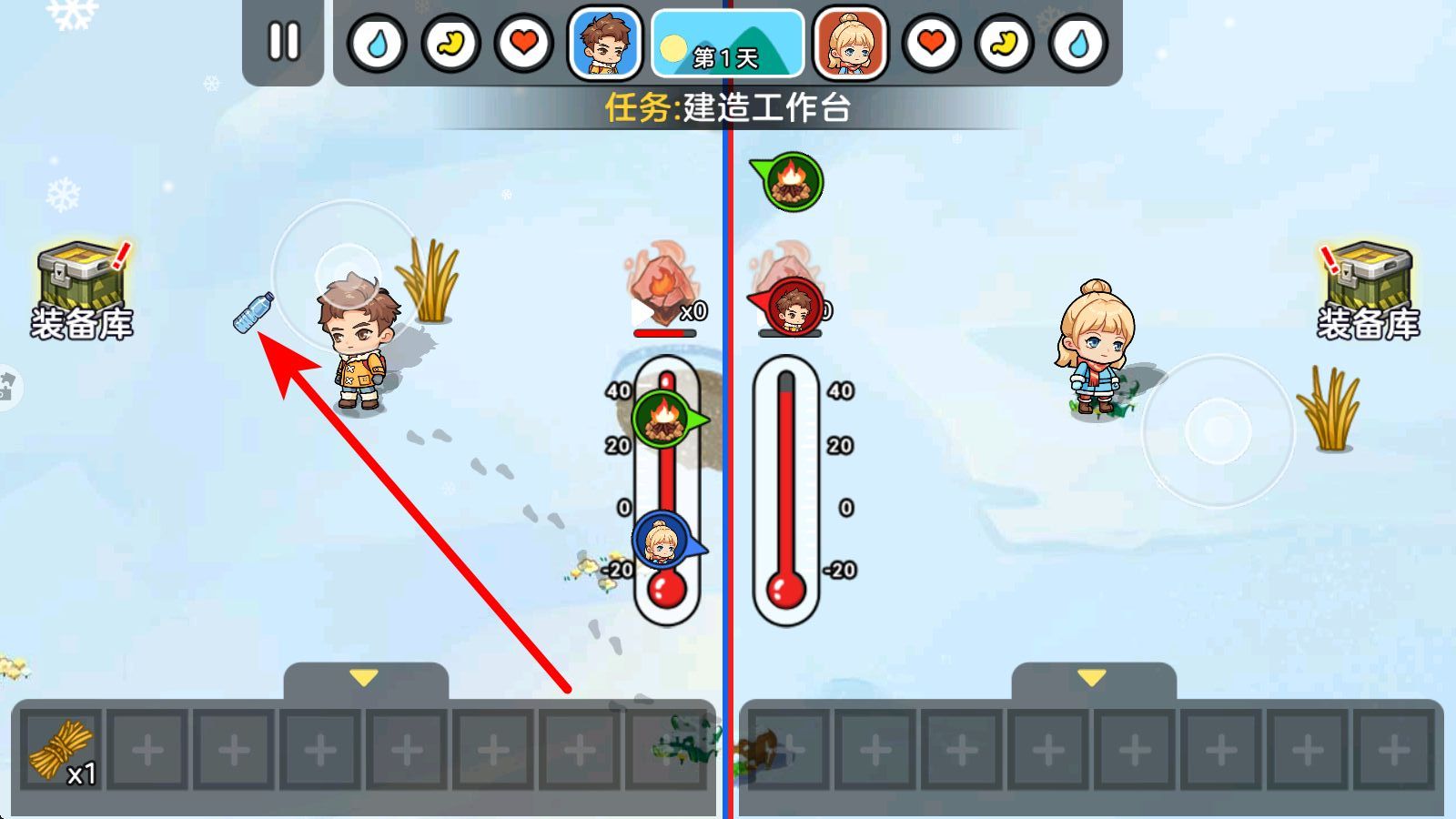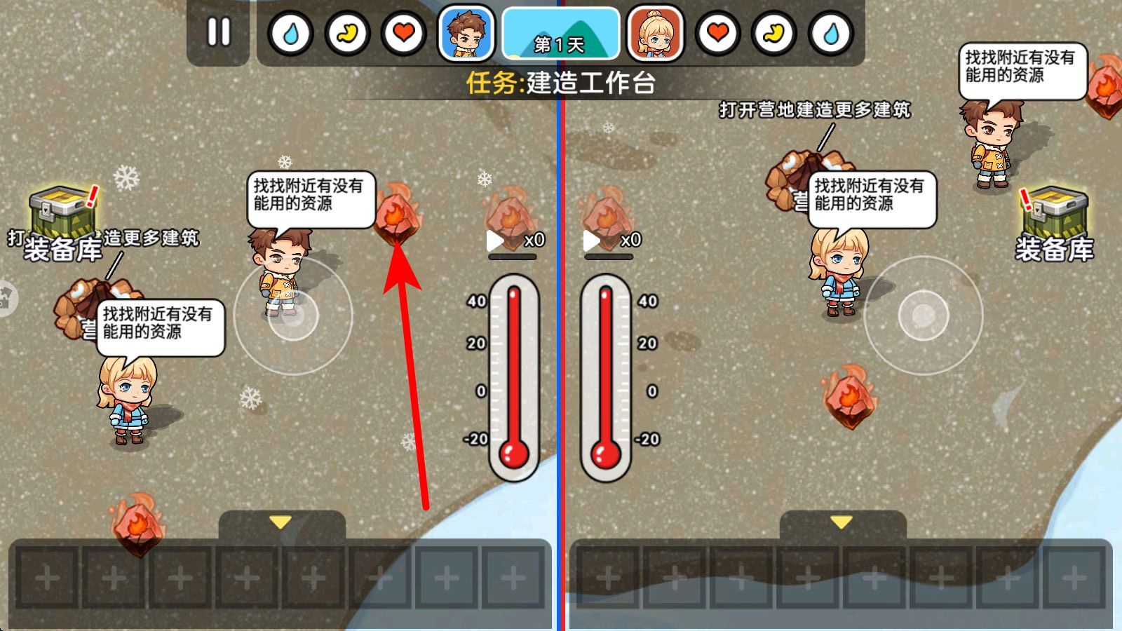 1、首日任務(wù)為建造工作臺(tái),搜索場(chǎng)景內(nèi)紅色火焰狀資源燃料與裝備庫(kù)周邊區(qū)域,兩人分工標(biāo)記資源點(diǎn)位,確保燃料、基礎(chǔ)物資覆蓋,為建造儲(chǔ)備核心素材。