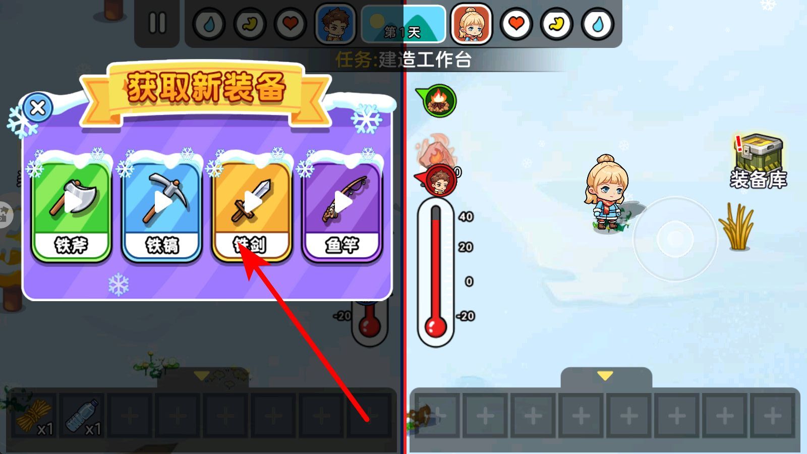 3、點(diǎn)擊裝備庫(kù)觸發(fā)獲取新裝備界面,依據(jù)分工選鐵劍近戰(zhàn)、鐵斧采集等武器,分配給對(duì)應(yīng)角色,提升資源采集或野獸對(duì)抗效率,優(yōu)化首日生存節(jié)奏。