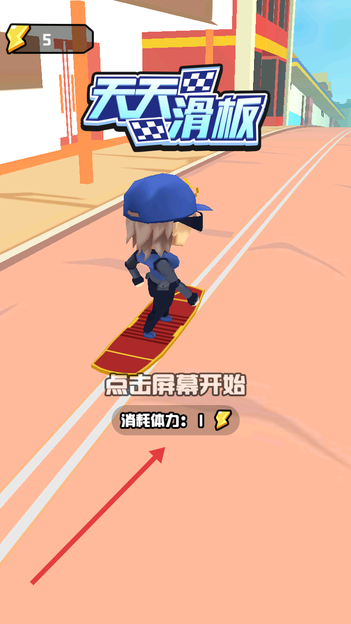 1、點(diǎn)擊屏幕,消耗1體力開啟天天滑板,角色踩上滑板,進(jìn)入城市背景的賽道,開啟競(jìng)速之旅。