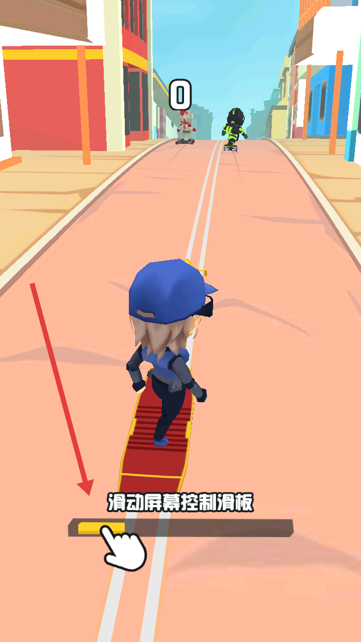 2、滑動(dòng)屏幕控制滑板左右移動(dòng),靈活避開道路障礙,緊盯前方對(duì)手,找準(zhǔn)時(shí)機(jī)完成超車。