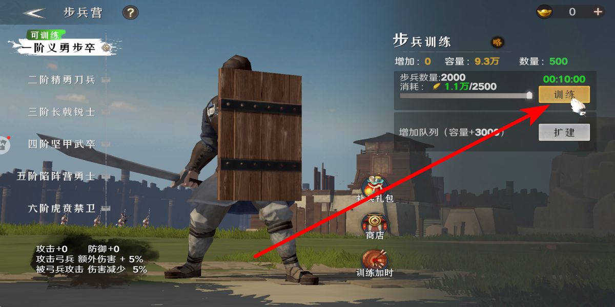 3、兵力籌備訓(xùn)練步兵進(jìn)入步兵營(yíng)界面,選定一階義勇步卒,消耗糧草資源點(diǎn)擊訓(xùn)練,等待時(shí)長(zhǎng)獲取士兵,提升兵力規(guī)模以應(yīng)對(duì)前期戰(zhàn)斗。