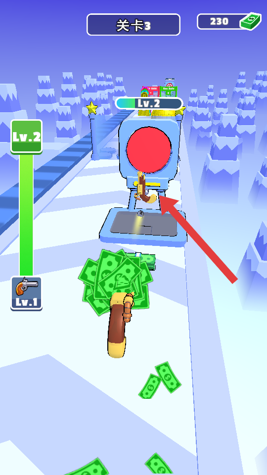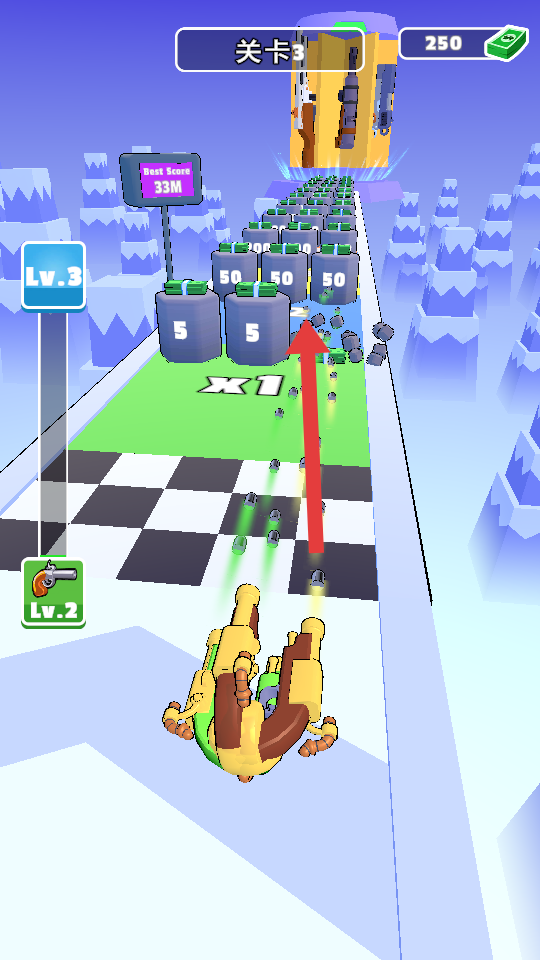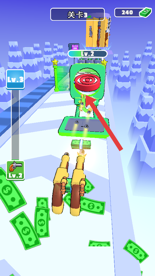 2、武器升級(jí)后,快速通過綠色的增益區(qū),保持射擊的節(jié)奏,清理路徑的靶子,積累貨幣到250+。