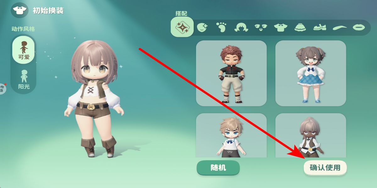 1、角色設(shè)定,進(jìn)入初始換裝界面,左側(cè)選可愛或陽光動作風(fēng)格,右側(cè)點擊心儀初始形象,確認(rèn)后點擊確認(rèn)使用,完成角色創(chuàng)建開啟浮空島冒險。