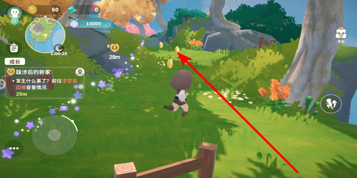 2、場景收集,新手出生后跟隨跋涉后的新家任務(wù)指引,前往浮空島邊緣,場景中金色物件為金幣,靠近自動拾取,積累資源用于后續(xù)建造與互動。