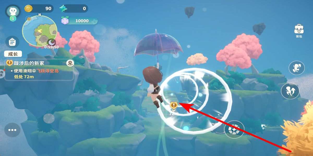 3、飛行挑戰(zhàn),抵達(dá)浮空島邊緣觸發(fā)滑翔傘任務(wù),點擊技能圖標(biāo)展開滑翔傘,操控角色穿過空中光環(huán)標(biāo)記,完成飛躍浮空島低處挑戰(zhàn),推進(jìn)成長任務(wù)。