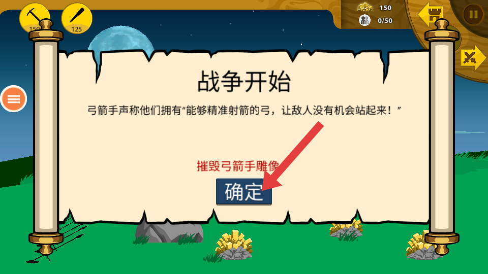 1、進(jìn)入游戲先點(diǎn)擊確定,接取摧毀弓箭手雕像主線,完成主線推進(jìn)解鎖基礎(chǔ)玩法,為開啟每周任務(wù)鋪路。
