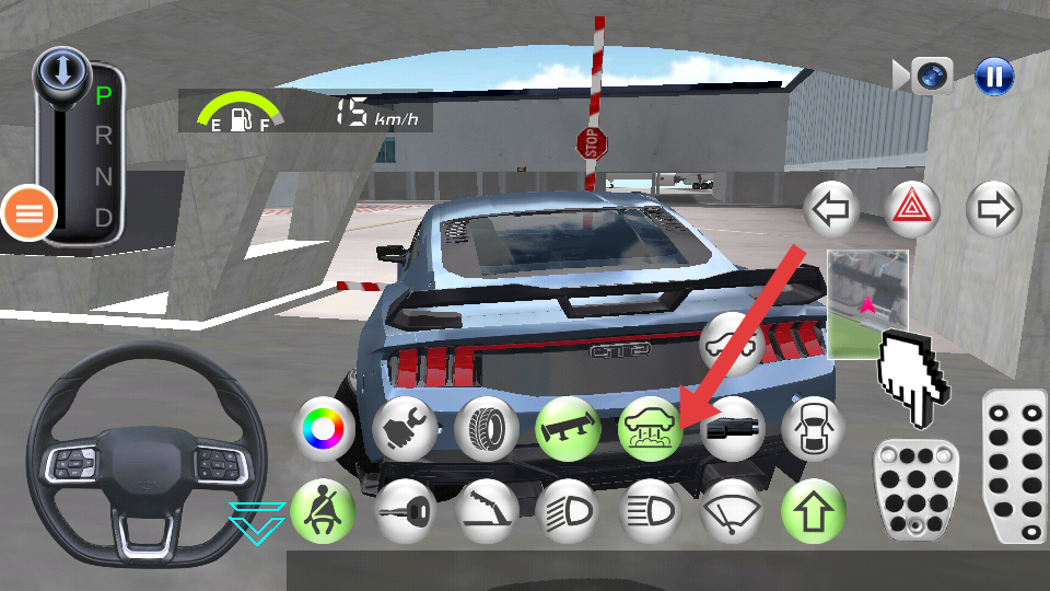 1、進(jìn)入駕駛場景,先確認(rèn)底部功能區(qū),點擊安全帶圖標(biāo)系好安全帶,再通過換擋桿切換擋位,為駕駛操作做準(zhǔn)備。