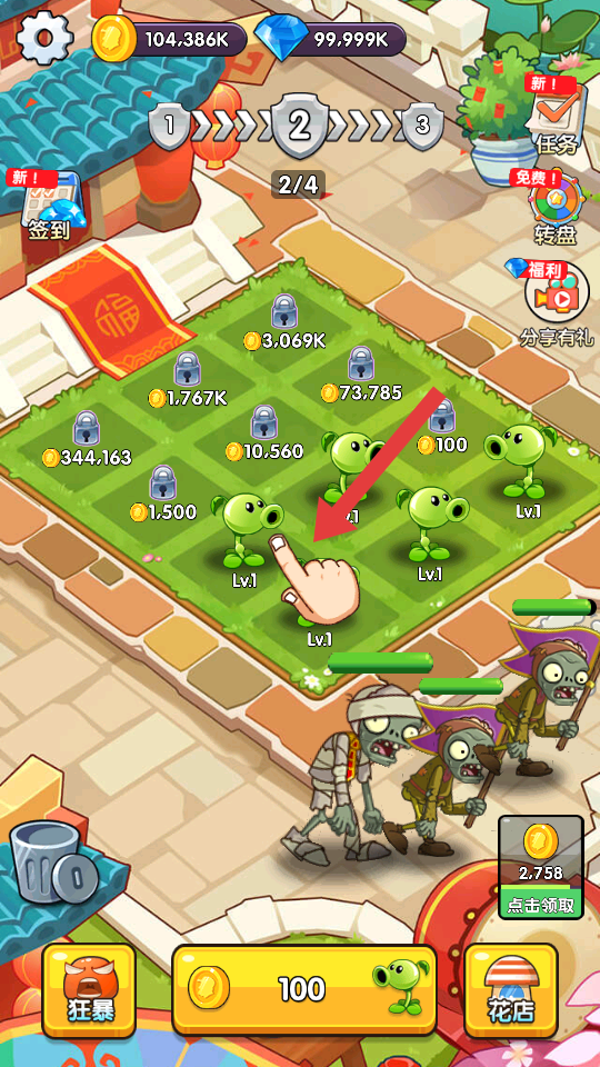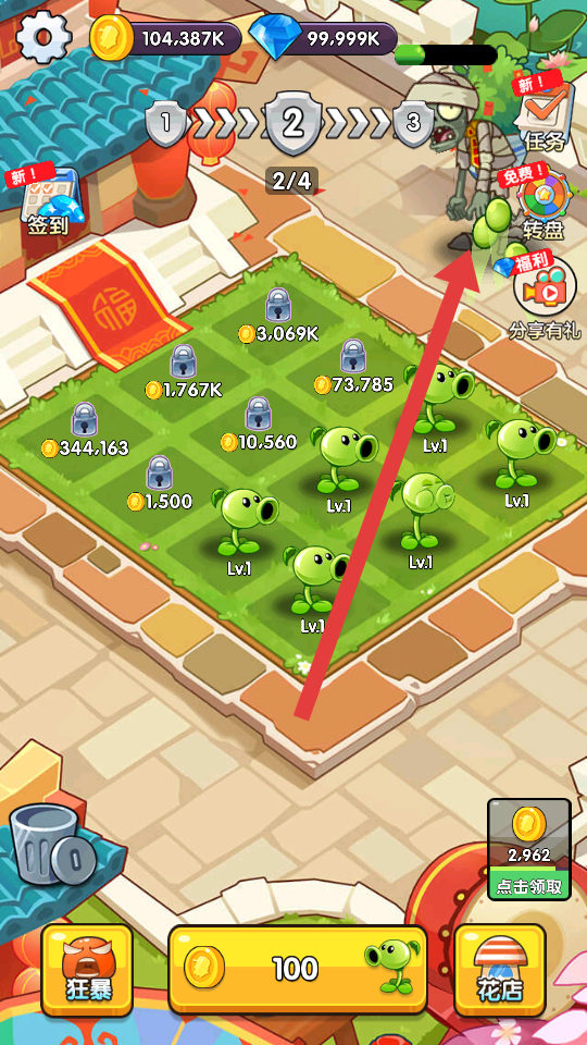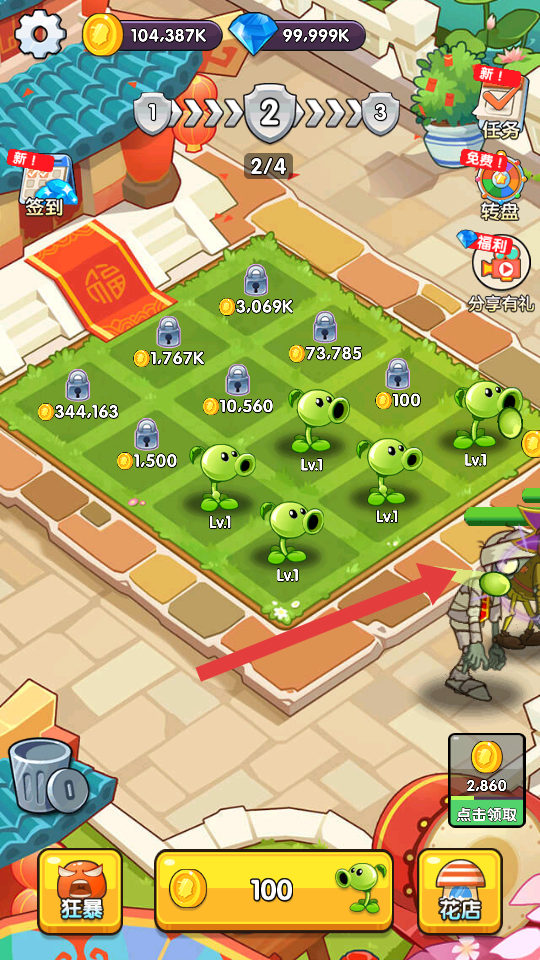 3、推進關卡時,留意右上角的任務與福利入口,完成任務可獲取獎勵;遇到大量僵尸時,提升植物攻擊的效率。