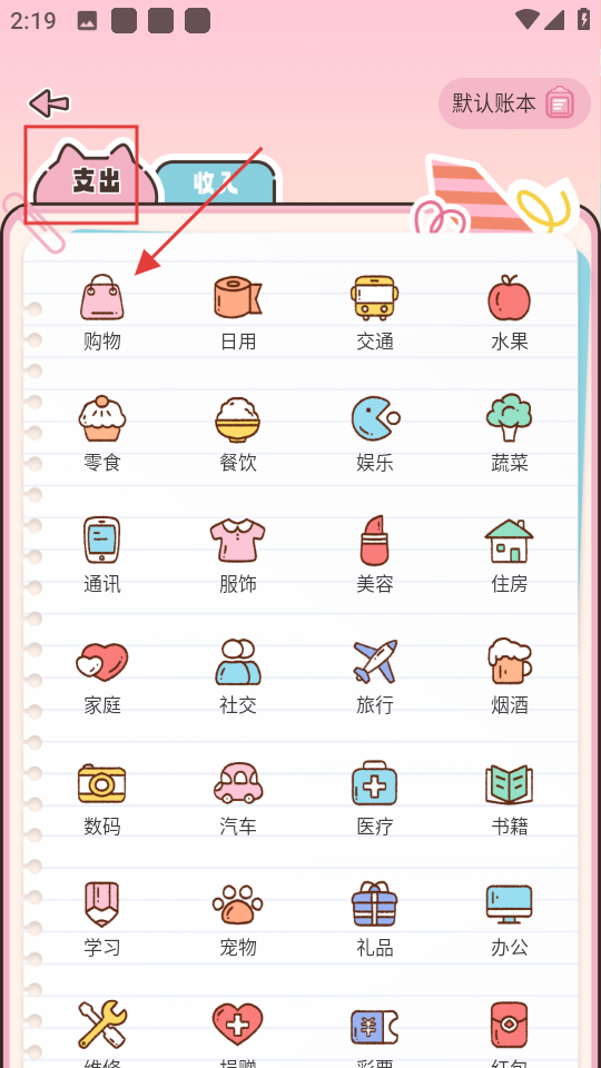 2、在支出分類選對(duì)應(yīng)圖標(biāo),如購(gòu)物,進(jìn)入金額填寫頁(yè)。