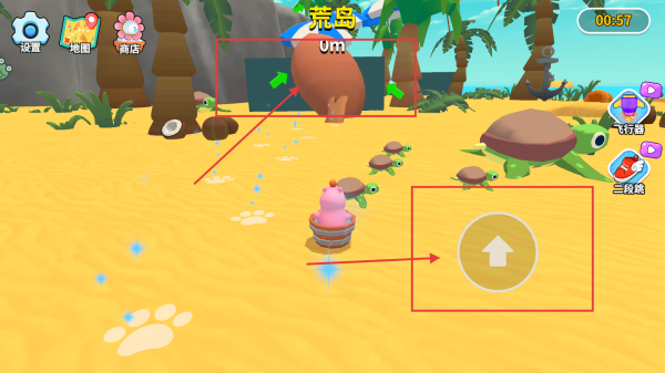 1、在【荒島】場(chǎng)景,操控粉色角色時(shí),點(diǎn)擊右側(cè)向上箭頭按鈕移動(dòng),跟隨烏龜?shù)姆较蚯斑M(jìn),逐步探索區(qū)域。