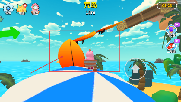 2、借助橙色道具在海面移動(dòng)時(shí),跟隨綠色箭頭的指引方向,此時(shí)距離顯示【18m】,沿著海面推進(jìn)。