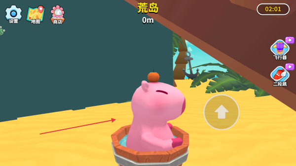 3、回到沙灘【0m】處后,繼續(xù)點(diǎn)擊右側(cè)向上箭頭按鈕,操控粉色角色在荒島的沙灘區(qū)域移動(dòng)探索。