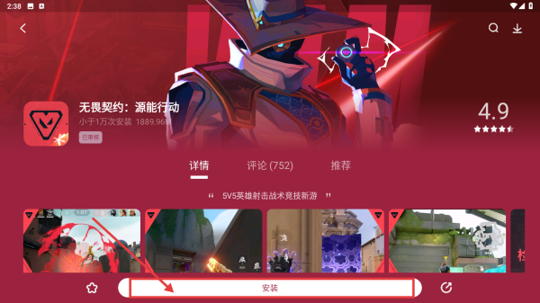 3、在游戲詳情界面,點擊安裝按鈕,開始下載并安裝無畏契約源能行動游戲。