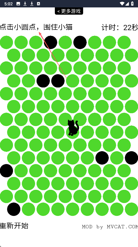 1、進(jìn)入游戲,查看屏幕右上方計(jì)時(shí)22秒,根據(jù)提示點(diǎn)擊小圓點(diǎn),圍住小貓開始操作。