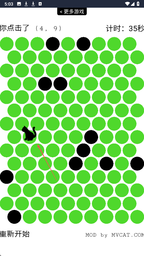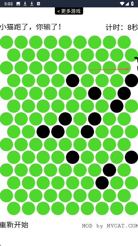 3、若小貓成功跑出包圍圈,游戲會(huì)提示小貓跑了,你輸了,可點(diǎn)擊重新開始再次挑戰(zhàn)。