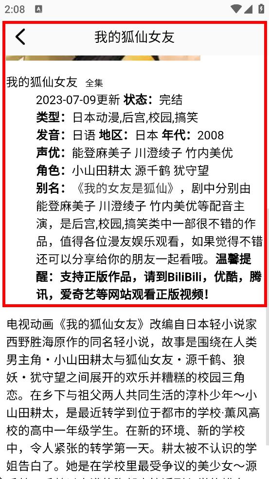 3、進(jìn)入詳情頁(yè),可查看該動(dòng)漫的更新時(shí)間、類型、聲優(yōu)等信息。