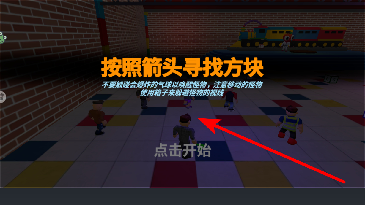 2、進(jìn)入模式后,界面會(huì)出現(xiàn)按照箭頭尋找方塊的提示,點(diǎn)擊點(diǎn)擊開始,便開啟在場景中的探索,要沿著箭頭指引,仔細(xì)搜尋方塊的位置。