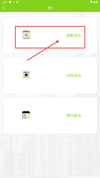 2、在洗衣頁面,點擊搜索洗衣選項,進入搜索設(shè)備流程。