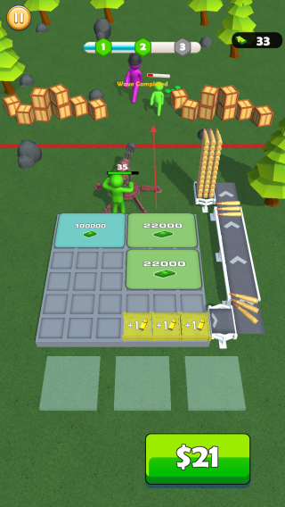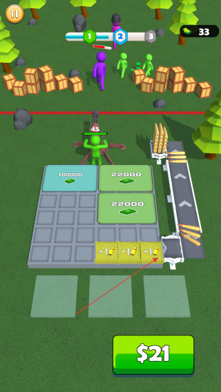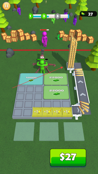 3、綠色小人持續(xù)用槍械和右側(cè)武器攻擊敵人,關(guān)注上方進度條,利用+1等道具提升攻擊,消滅敵人獲取$27獎勵。