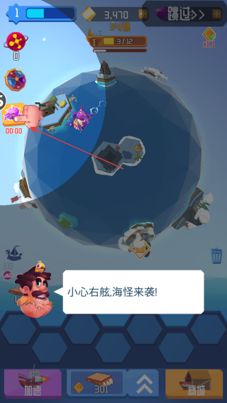 1、進(jìn)入游戲查看左上角等級1和資源數(shù)量3470,留意提示小心右舷,海怪來襲!,了解海怪出現(xiàn)方位。