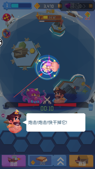 2、當(dāng)海怪出現(xiàn)后,點擊屏幕上的海怪進(jìn)行攻擊,依據(jù)提示炮擊!炮擊!快干掉它!,集中火力消滅海怪。