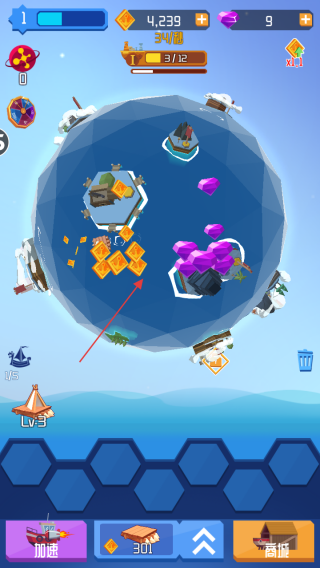 3、成功擊敗海怪后,收集掉落的資源,利用資源在下方功能區(qū)升級或合并艦船,提升實力應(yīng)對后續(xù)挑戰(zhàn)。