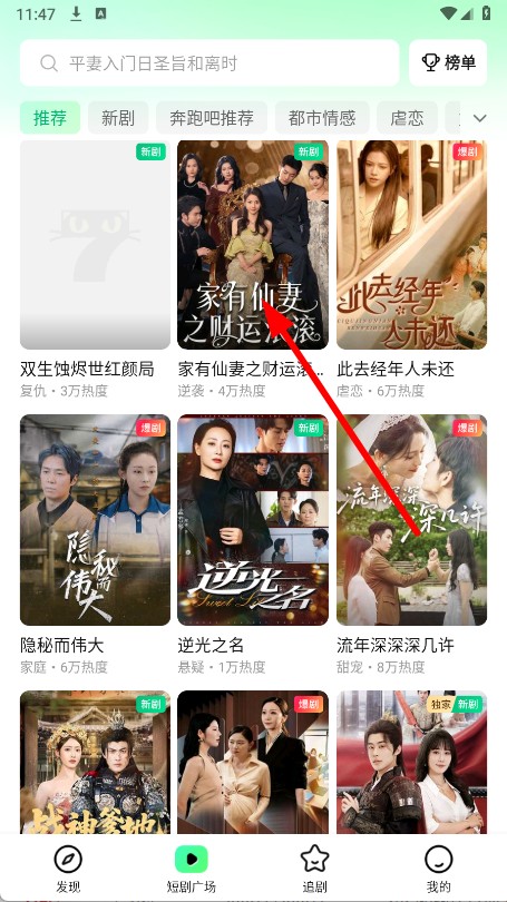 1、打開軟件,在短劇廣場推薦列表,找到短劇并點擊進入。