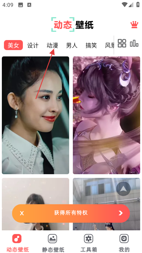 1、在動(dòng)態(tài)壁紙頁(yè)面,點(diǎn)擊動(dòng)漫分類,切換到動(dòng)漫類動(dòng)態(tài)壁紙展示。