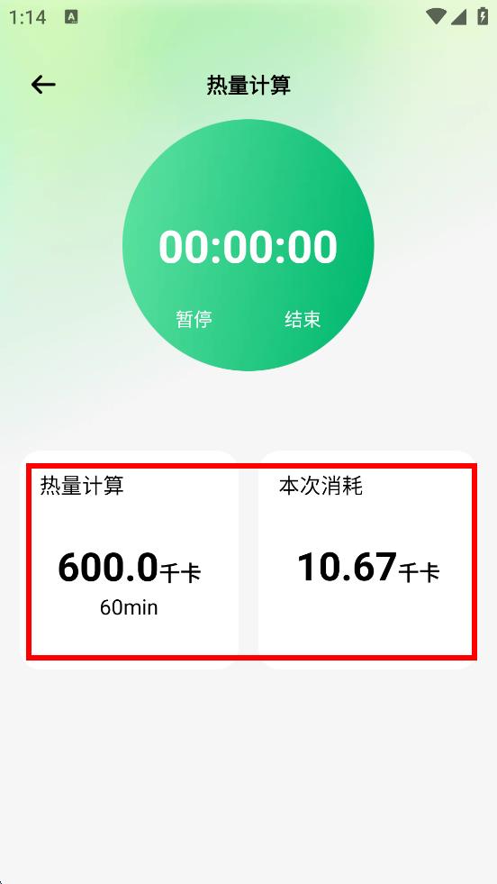 4、運(yùn)動(dòng)計(jì)時(shí)結(jié)束后,可查看熱量計(jì)算和本次消耗的千卡數(shù)。