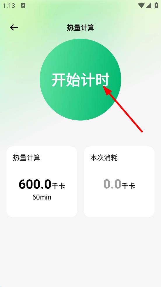 3、進(jìn)入熱量計(jì)算頁(yè)面,點(diǎn)擊開(kāi)始計(jì)時(shí),開(kāi)始記錄運(yùn)動(dòng)。
