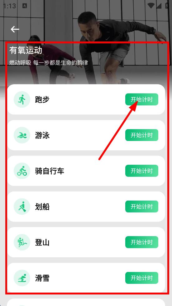 2、在有氧運(yùn)動(dòng)頁(yè)面,選擇運(yùn)動(dòng)項(xiàng)目,如點(diǎn)擊跑步的開(kāi)始計(jì)時(shí)。