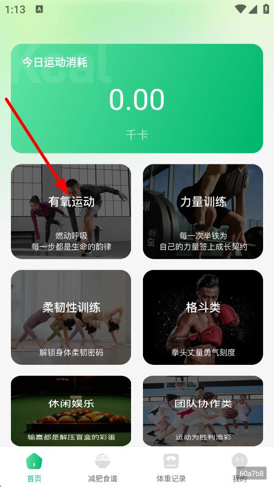 1、在首頁(yè),點(diǎn)擊有氧運(yùn)動(dòng),進(jìn)入有氧運(yùn)動(dòng)選擇頁(yè)面。