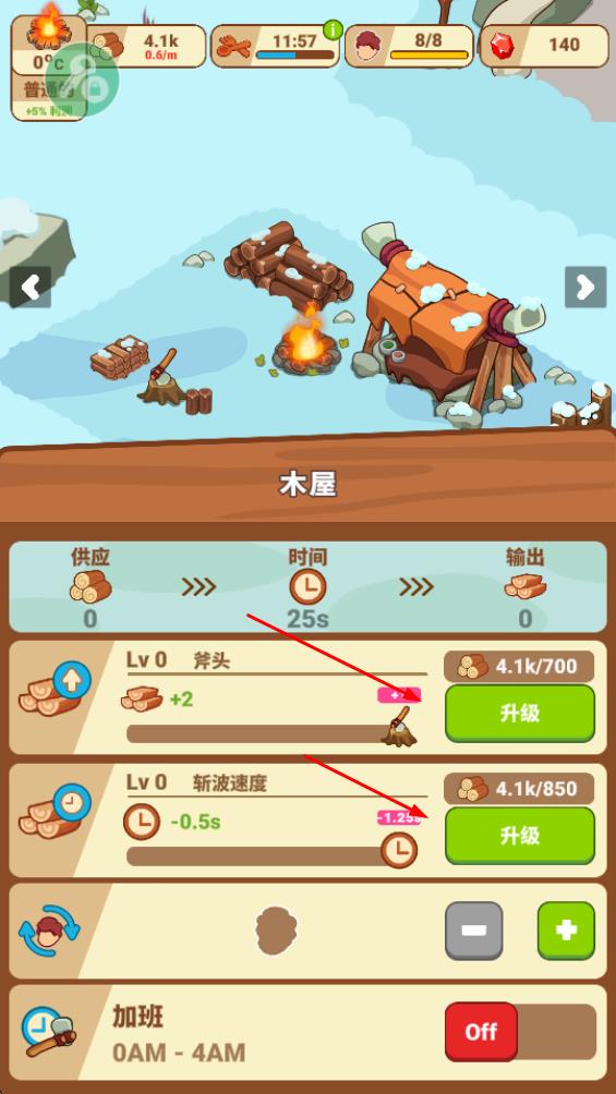 1、在木屋界面,可升級斧頭提升木材獲取量,也能升級斬波速度縮短加工時間,助力資源生產(chǎn)。