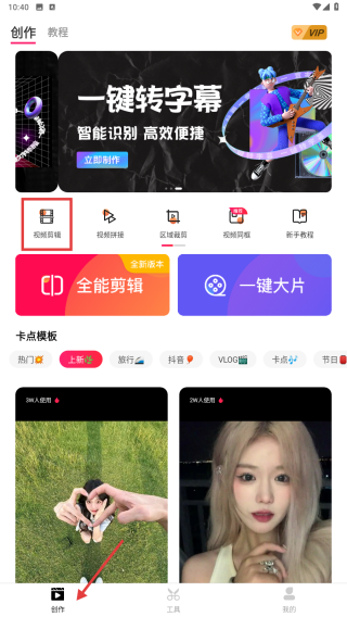 1、進(jìn)入愛剪輯創(chuàng)作頁面,可使用一鍵轉(zhuǎn)字幕、全能剪輯、一鍵大片等功能,也能選擇卡點模板進(jìn)行創(chuàng)作。