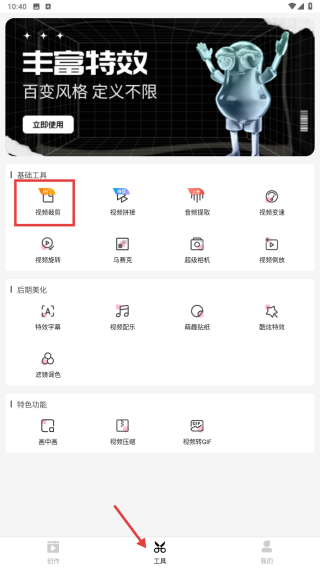 2、點擊底部工具選項,使用視頻提取、視頻拼接、音頻提取等工具處理視頻。