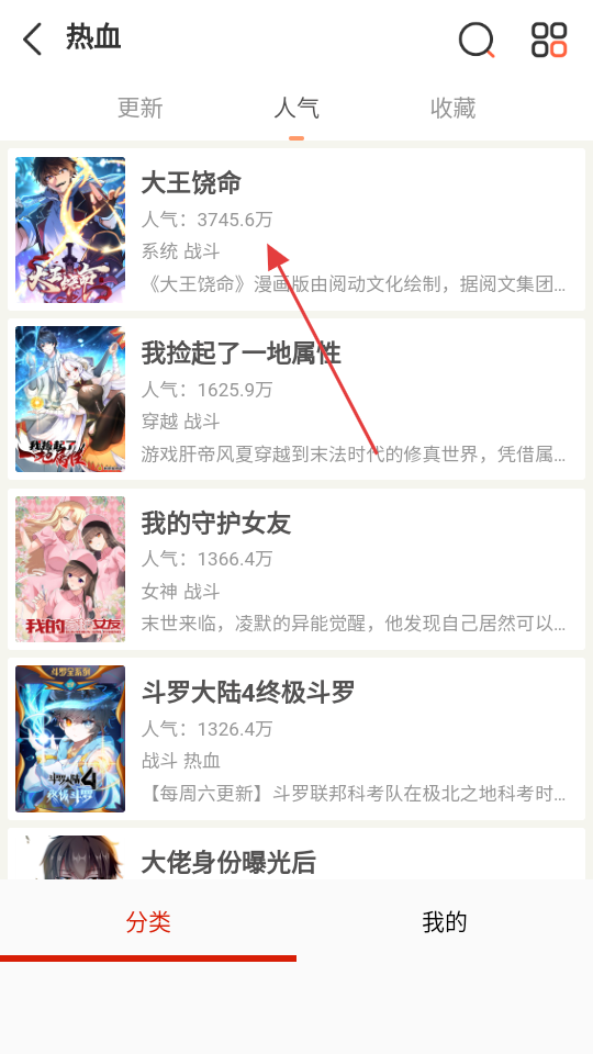4、在熱血類內(nèi)容頁面,可選擇喜歡的作品,比如大王饒命點擊查看。