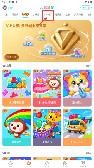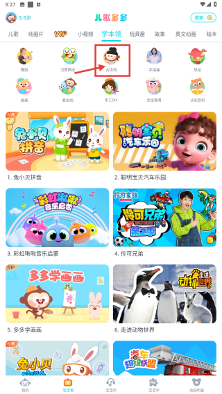 1、打開兒歌多多應(yīng)用,點擊頂部學(xué)術(shù)館選項,進入學(xué)術(shù)館頁面。