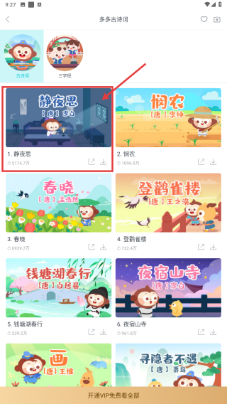 1、篩選適配內(nèi)容:打開軟件后,根據(jù)孩子年齡或?qū)W習(xí)需求,在分類板塊中選擇對應(yīng)資源,如給低齡兒童選搖籃曲,給學(xué)齡兒童選唐詩三百首,精準(zhǔn)匹配學(xué)習(xí)內(nèi)容。
