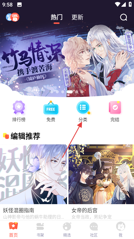 1、分類查找漫畫:打開軟件后進(jìn)入分類板塊,根據(jù)自身喜好選擇仙俠、都市等題材分類,在列表中瀏覽并挑選漫畫。