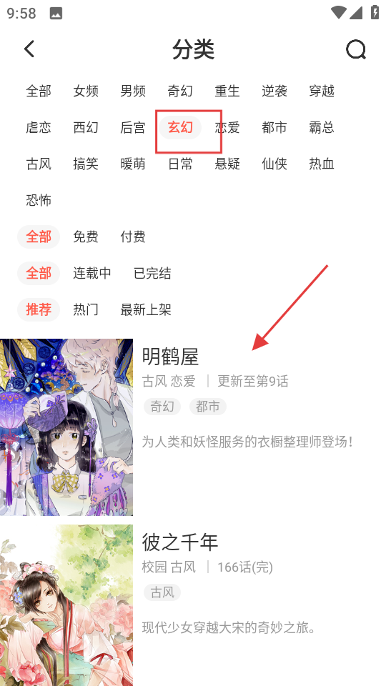 2、在分類頁面,點(diǎn)擊玄幻分類,找到漫畫明鶴屋并點(diǎn)擊。