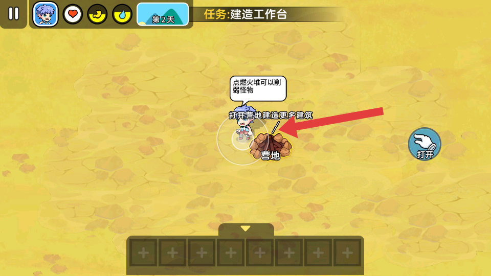 1、游戲開(kāi)始后,先點(diǎn)擊箭頭指向的營(yíng)地,進(jìn)入營(yíng)地界面,這里可以建造各類(lèi)建筑,同時(shí)點(diǎn)燃火堆,能削弱周?chē)治?,為生存?chuàng)造環(huán)境。