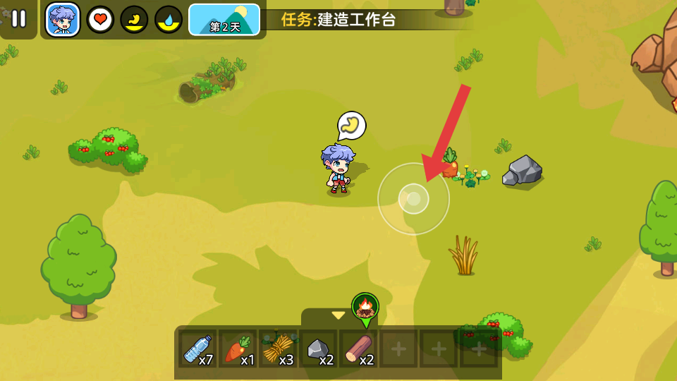 2、在野外探索時(shí),看到箭頭指向的控制角色的按鍵,移動(dòng)靠近后進(jìn)行采集,可獲取胡蘿卜、木材等資源,建造工作臺(tái)等建筑的重要材料。