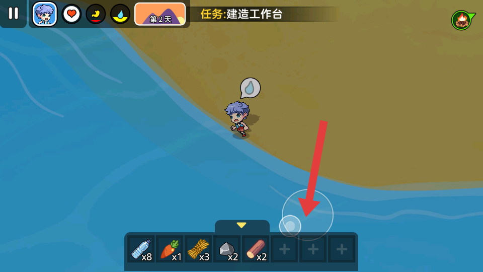 3、當(dāng)角色口渴時(shí),前往箭頭指向的水源處,靠近水源進(jìn)行互動(dòng),補(bǔ)充水分,維持角色的生存狀態(tài),確保能夠持續(xù)的進(jìn)行探索與建造。