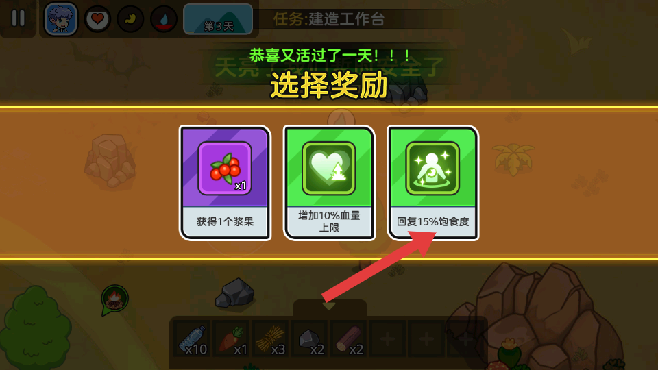 4、成功存活一天后,會(huì)出現(xiàn)獎(jiǎng)勵(lì)選擇界面,優(yōu)先選擇箭頭指向的回復(fù)15%飽食度獎(jiǎng)勵(lì),及時(shí)補(bǔ)充飽食度,讓角色保持著良好的狀態(tài)。